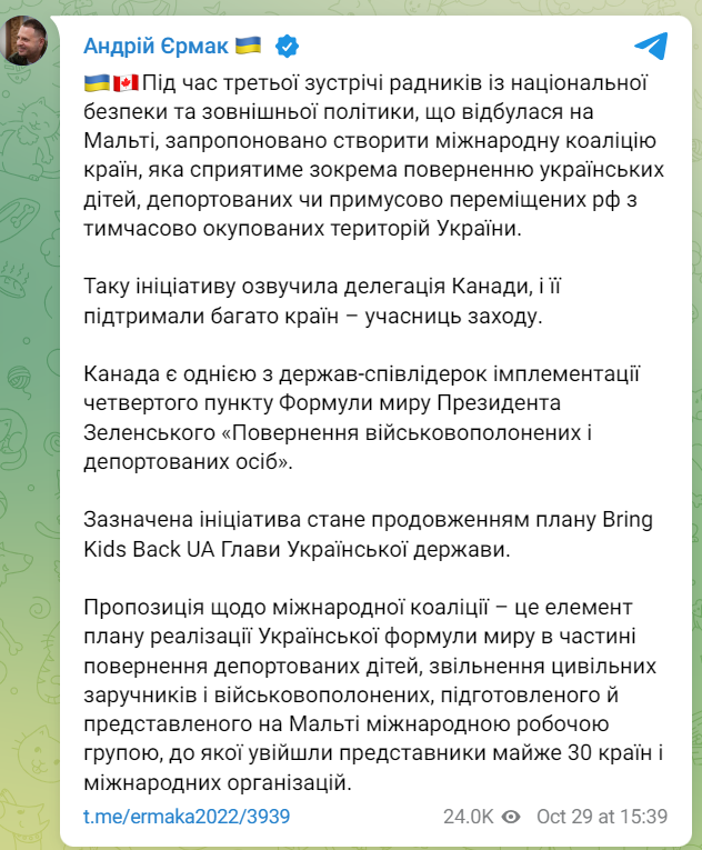 На Мальті відбулася зустріч радників з національної безпеки та зовнішньої політики. На ній було запропоновано створити міжнародну коаліцію країн, яка сприятиме поверненню українських дітей, яких депортувала Росія або вимушено перемістила з тимчасово окупованих територій.