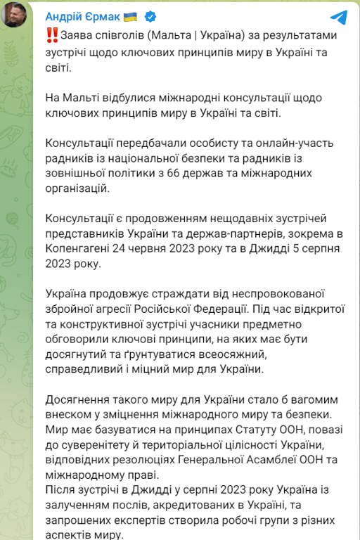 Водночас Єрмак опублікував заяву співголів (Мальта — Україна).