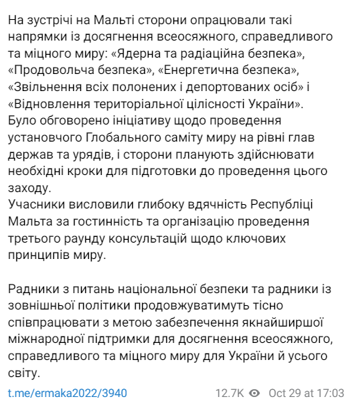 Нагадаємо, вчора, 28 жовтня, на Мальті відбулася третя зустріч радників з питань національної безпеки та зовнішньої політики щодо української Формули миру Володимира Зеленського. На ній представники України та інших країн обговорили питання ядерної, продовольчої, енергетичної безпеки.