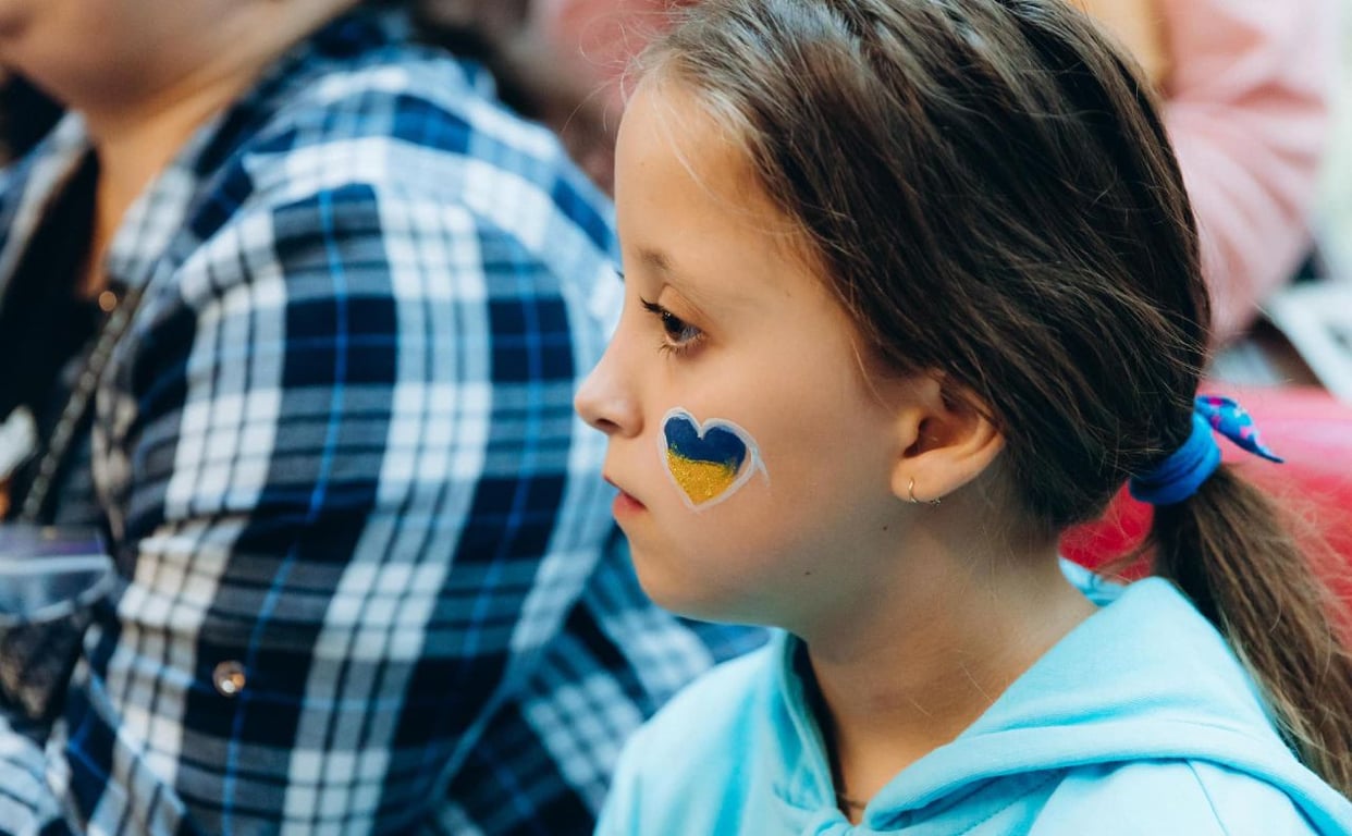 Маленькая девочка с украинским флагом в форме сердца на щеке. Фото: Охматдет