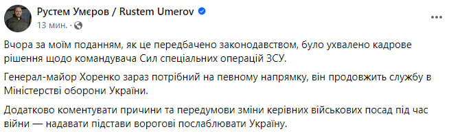 {'post': <Post: Умеров подтвердил, что по его представлению уволили командующего ССО Хоренко>,